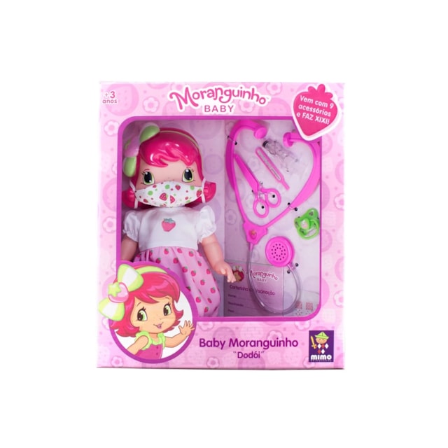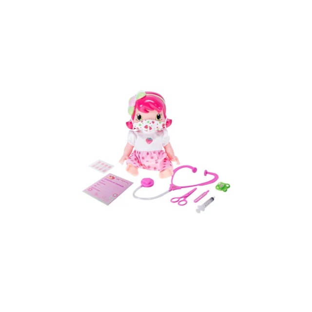 Feita em vinil, a Boneca Articulada Baby Moranguinho Dodói com Máscara da Mimo