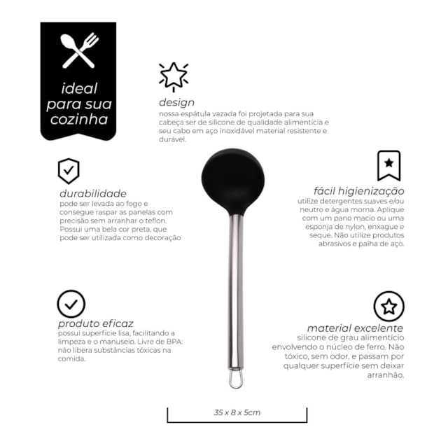 Possui uma bela cor preta, que pode ser utilizada como decoração. Colher de cozimento que permite a realização e montagem de pratos completos. Ideal para servir na mesa ou direto da panela.