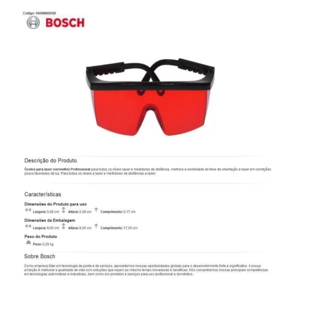 Os Óculos de Proteção para Nível com Laser Vermelho da BOSCH são um acessório indispensável para qualquer profissional que trabalhe com níveis a laser. Projetados para garantir segurança e precisão, esses óculos oferecem uma série de benefícios importantes. Com uma lente especial que filtra a luz laser vermelha, esses óculos protegem seus olhos contra danos potenciais causados pela exposição direta ao feixe laser. Isso é especialmente importante em situações onde você precisa alinhar ou nivelar com um nível a laser vermelho brilhante. Além da proteção, os óculos também melhoram a visibilidade, tornando as linhas laser mais nítidas e fáceis de ver, mesmo em condições de iluminação desafiadoras. Isso é crucial para garantir a precisão e a eficiência de suas tarefas de nivelamento e alinhamento. Os Óculos de Proteção para Nível com Laser Vermelho da BOSCH são ajustáveis e confortáveis de usar, tornando-os ideais para uso prolongado. Eles são uma adição valiosa ao seu kit de ferramentas, garantindo que você possa trabalhar com segurança e precisão em todas as aplicações de nível a laser. Garanta proteção e resultados precisos com este acessório essencial da BOSCH.