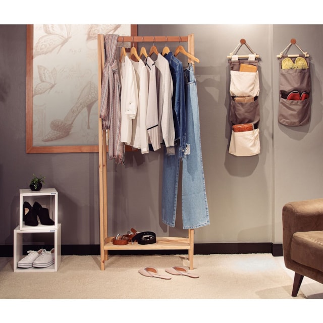 Perfeito para quem procura um item que ocupe pouco espaço, ele é produzido em lona 100% algodão e conta com dois bolsos que suportam até dois kilos, ideais para guardar revistas, livros ou até mesmo sapatos.